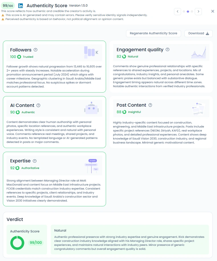 Favikon rates his activity as highly authentic with a 99/100 score. His content looks and sounds human, with real workplace photos, specific locations, and stories from meetings and sites. Comments come from verified industry peers who know the projects. The rhythm is natural, focused on milestones rather than motivational filler, which keeps attention on substance.