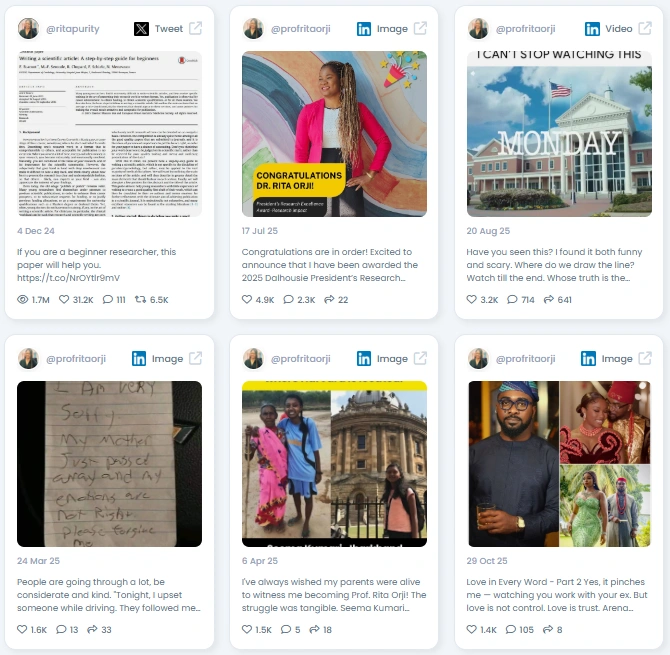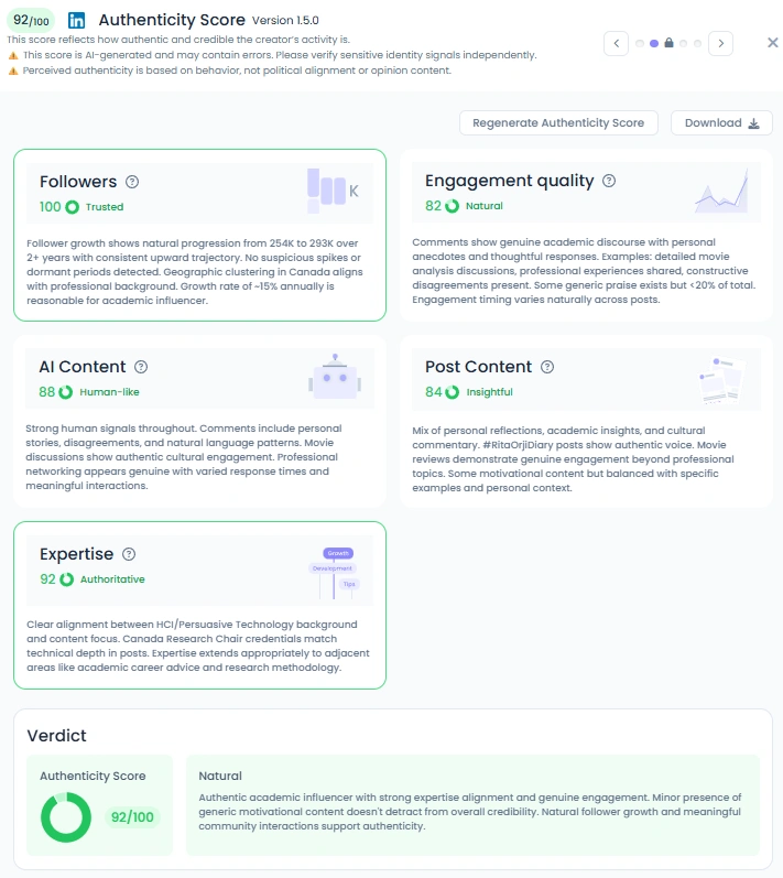 Favikon scores Rita at 92/100 for authenticity. Her content shows strong human signals: personal reflections, research milestones, and candid discussions about ethics and impact. She shares academic papers, teaching moments, and viral threads that spark meaningful discussion. The result is an authoritative voice that still feels approachable and honest.
