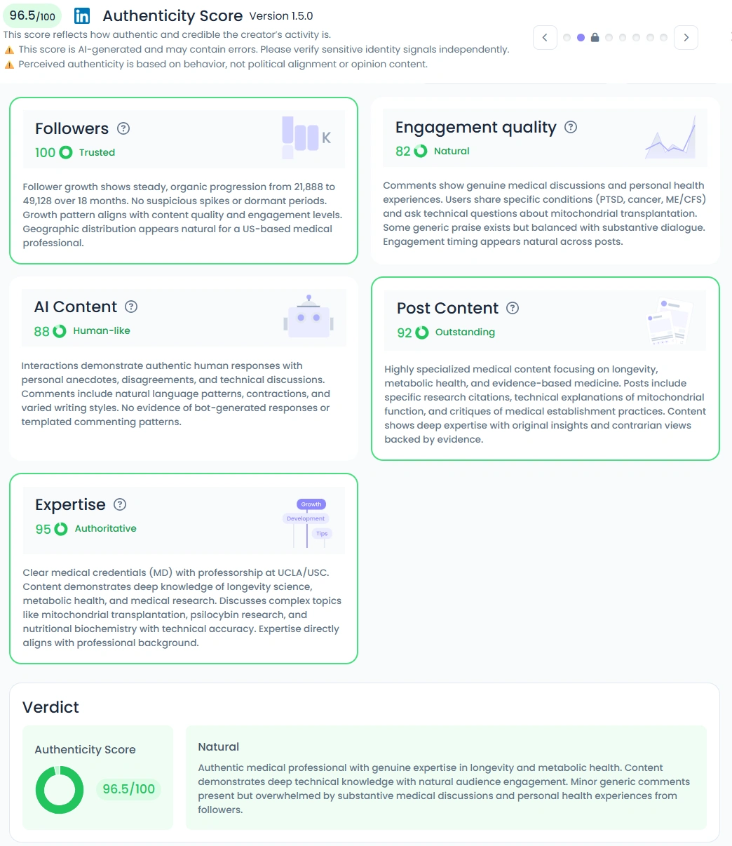 With an Authenticity Score of 96.5/100, Dr. Lufkin’s online presence feels both credible and personal. His content shows deep medical expertise balanced with humility and genuine curiosity. He shares visuals, studies, and commentary that encourage discussion rather than dictate conclusions. Followers regularly engage with him through thoughtful comments about their own health journeys, creating a collaborative and supportive environment. His authenticity lies in his transparency and his ability to educate without preaching.