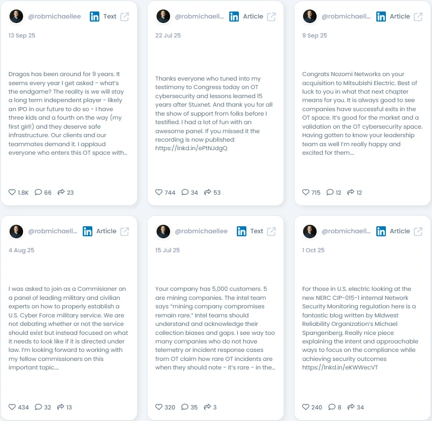Favikon gives Robert a 100/100 Authenticity Score. Comments show real experts debating details and sharing field stories. His posts reference congressional testimony, new NERC guidance, and real response work. No hype. Just original analysis backed by experience.