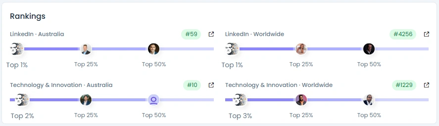 Ross has grown his LinkedIn following from 15,000 to over 31,000 in just a few years, showing steady and organic growth. His Influence Score is 7,047 points, placing him among the Top 1% on LinkedIn Australia and the Top 3% in Technology and Innovation worldwide. His Engagement Quality Score (90/100) highlights that his followers engage with his content through thoughtful discussions rather than surface-level reactions.