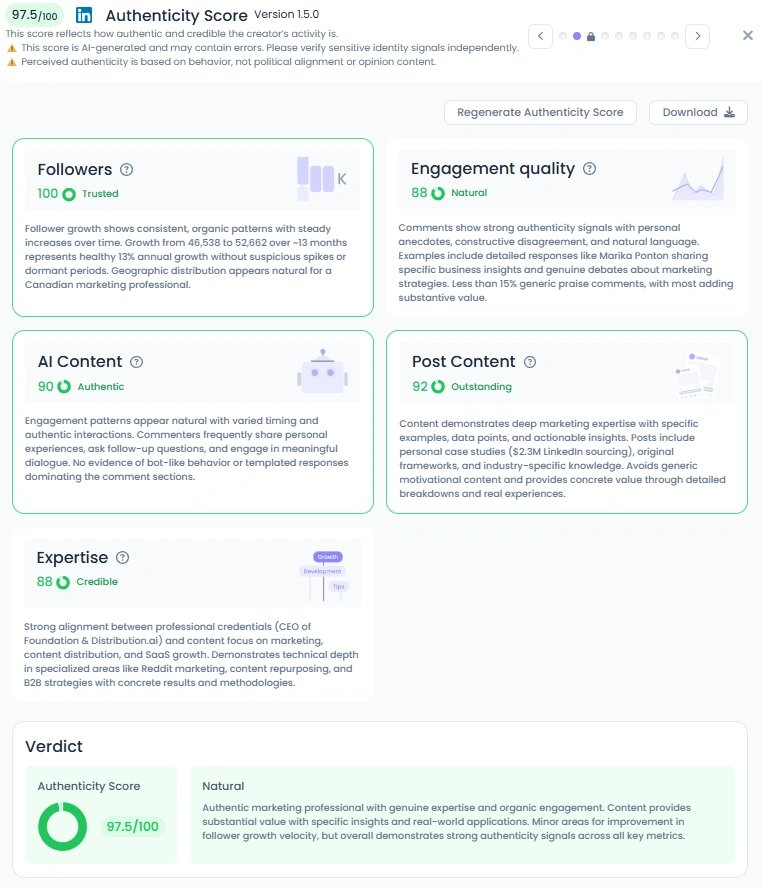 Favikon rates his authenticity at 97.5/100. Comments look like real peers trading stories and data. He shares family moments next to charts, which keeps the feed warm without losing focus. Posts tackle live topics such as LLM-era SEO and Reddit strategy, then back claims with experiments and screenshots.