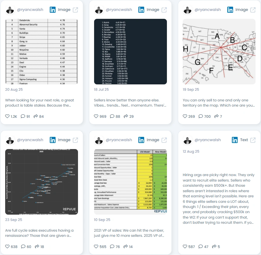 Ryan’s orbit crosses sales tech, cybersecurity, and data platforms. He engages with leaders and operators around brands like CrowdStrike, Zscaler, Palo Alto Networks, Databricks, Snowflake, and more. His audience is VP and CRO level on one side and ambitious sellers on the other. The mix gives him reach across hiring managers, recruiters, and top performing reps.