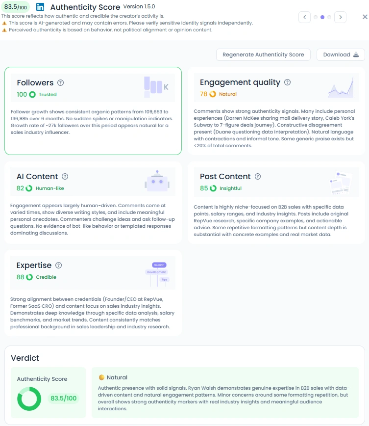 Favikon pegs his authenticity at 83.5 out of 100. Comments show real people telling their own stories and pushing the conversation forward. He invites debate on data interpretation and takes feedback in stride. The feed balances crisp visuals with short, plain language insights that feel earned.