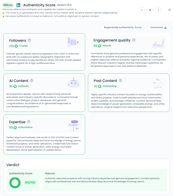 Al Tayer earns a perfect 100 Authenticity Score, and it shows. His posts include project photos, official events, visits, team moments, and clear insights into ongoing initiatives. Engagement is natural, with followers asking informed questions and sharing their own industry experiences. His consistency proves that senior leaders can be visible online without losing credibility. He communicates like someone who is genuinely invested in the progress he shares.
