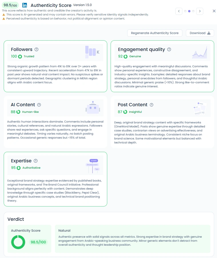 Said Baaghil’s Favikon Authenticity Score of 98.5/100 reflects how genuine and consistent his presence is online. His growth from 41K to 81K followers over three years has been completely organic, showing real interest and trust in his ideas. He writes the way he speaks, with warmth, intellect, and respect for dialogue. His engagement is thoughtful, often filled with detailed comments and discussions rather than generic praise. This level of connection sets him apart as both an expert and a mentor to his audience.