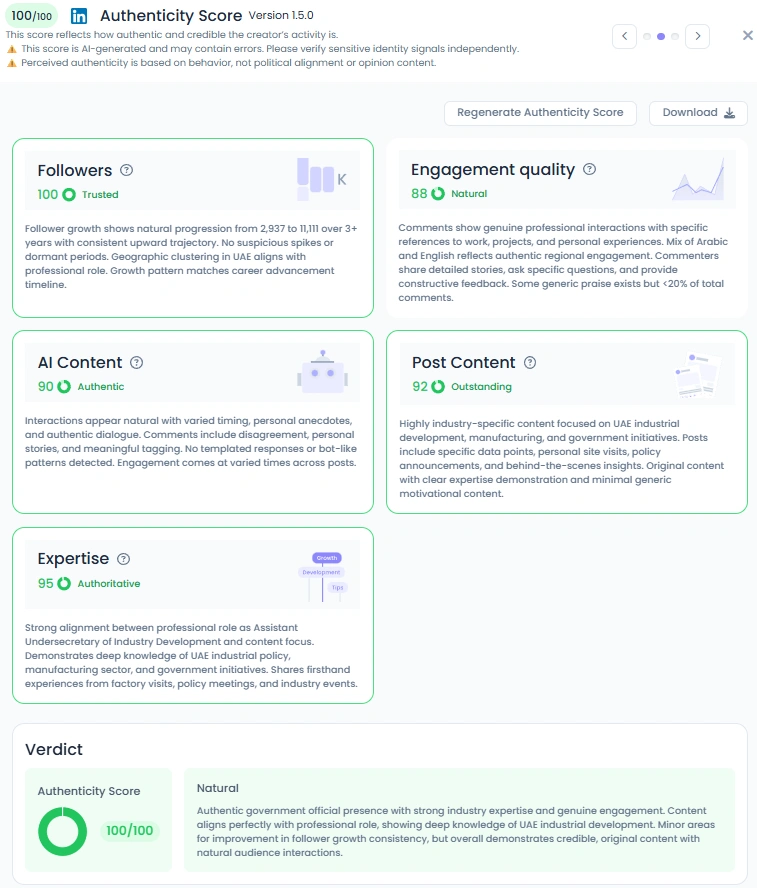 Salama Alawadhi’s perfect 100/100 Authenticity Score and “Natural” verdict confirm her status as a transparent and genuine public figure. She balances her formal government role by sharing personal updates, such as career milestones and motivational content, alongside her official policy posts. Her AI Content score of 90 (Authentic) confirms that her interactions are varied and human, featuring personal anecdotes and direct dialogue. This blend of Authoritative expertise (95 score) and natural communication is what makes her content instantly credible and engaging to a broad, professional audience.