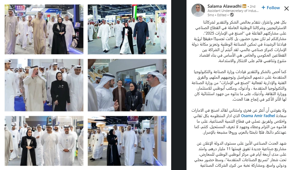 Salama Alawadhi is an essential voice in the discourse surrounding the UAE’s industrial future. As a high-ranking government official, she doesn't just comment on policy; she actively shapes it, providing a rare, behind-the-scenes view of the nation's economic engine. She has established herself as a Public Official and Policy Commentator with an exceptional 100/100 Authenticity Score, proving that authority and transparency can coexist seamlessly. For anyone tracking the next wave of global manufacturing and technology, her feed is required reading.