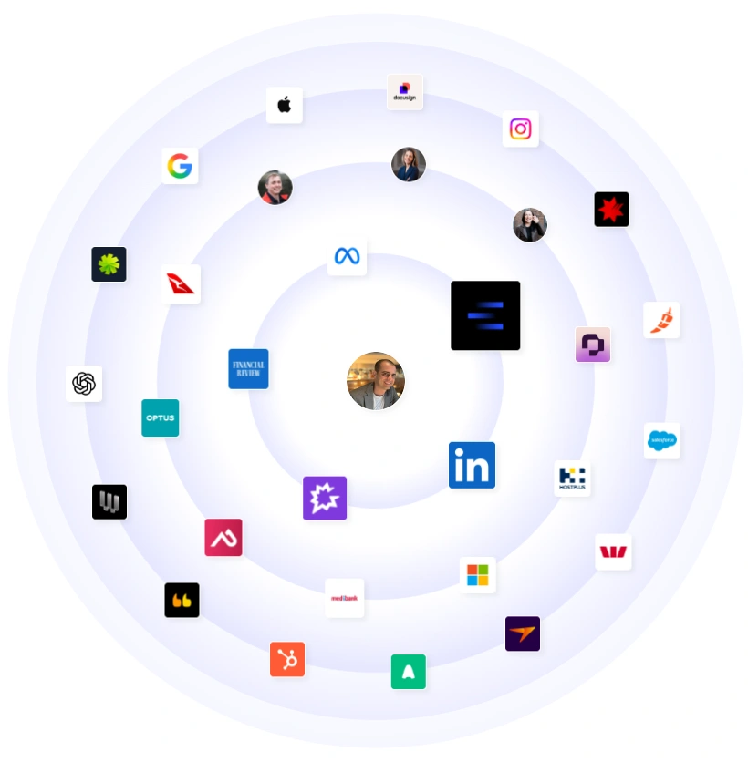 Sam’s network spans global tech brands, Australian enterprise leaders, founders, and revenue operators. The map shows connections with companies like Google, Apple, Meta, HubSpot, Salesforce, and major Australian institutions. He also stays close to media outlets like the Australian Financial Review and industry influencers in sales and revenue. This mix of enterprise players and tech innovators gives him reach across several high-impact circles.