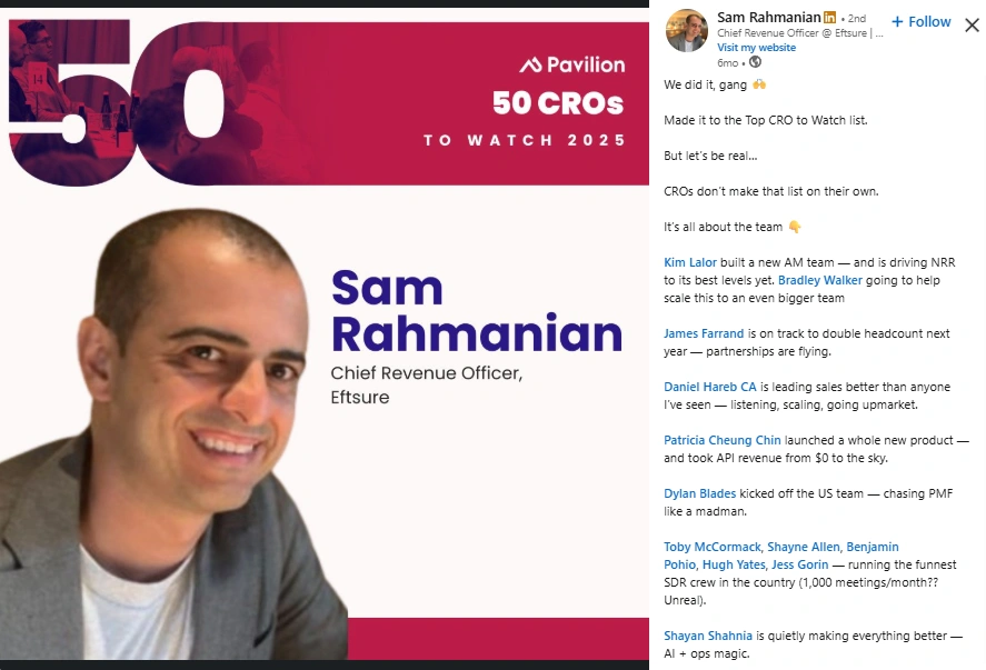 Sam collaborates with sales leaders, CRO communities, media outlets, and enterprise teams. His shoutouts to colleagues, partnerships with sales organizations, and appearances in lists like “Top CROs to Watch” strengthen his credibility. He also works closely with the Eftsure team to highlight fraud prevention education and innovation.