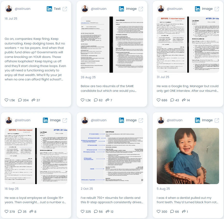 Sam Struan has turned résumé writing into an art form. Known for transforming overlooked LinkedIn profiles into interview magnets, he’s built a loyal following by showing professionals how to tell their career stories better.