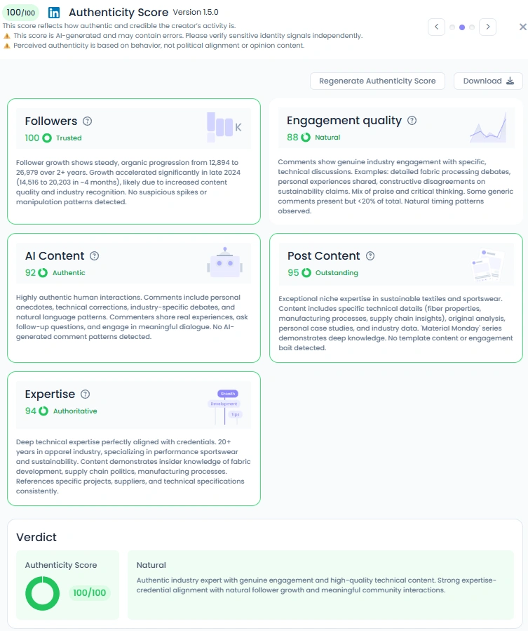 Favikon rates her Authenticity Score at 100/100. Commenters share real experiences and technical corrections, which she meets with openness and receipts. Signals are strong across Engagement Quality 88, Post Content 95, and Expertise 94. The vibe is expert neighbor, not lecturer.