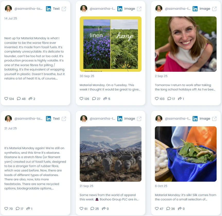 She makes sustainability feel practical and human. One post might unpack elastane. The next breaks down supply chains in plain English. If you work in apparel and want fewer buzzwords and more facts, Samantha is your person.