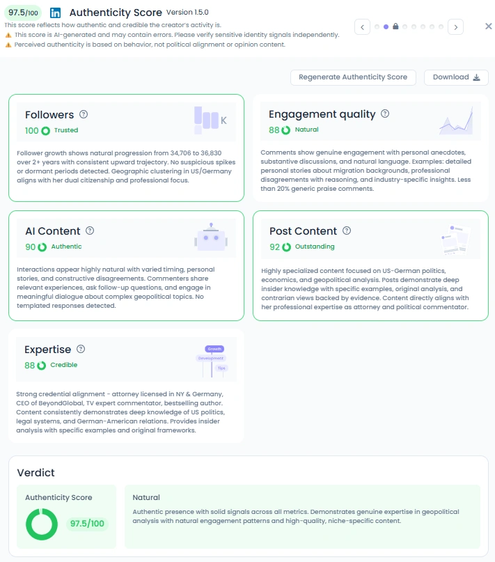 Sandra has a strong authenticity score of 97.5 out of 100, supported by natural engagement and a healthy mix of comments from real viewers. Her audience shares personal stories, disagreements, and thoughtful questions, which shows genuine trust. She posts videos from studios, live appearances, and personal reflections that feel grounded rather than staged. Her timing, writing style, and varied content show that she is present, active, and involved in her field every day.