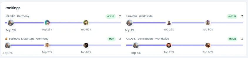 Sandra’s audience grew from about 34.7K to 36.8K followers over two years with a consistent upward pattern. Her influence score is an impressive 8,092 points, placing her in the top tier of German LinkedIn creators. Engagement quality sits at a natural 88, showing that followers respond with meaningful thoughts rather than generic praise. Her posting rhythm aligns with major political events, debates, and legal developments, which helps her stay timely and relevant.