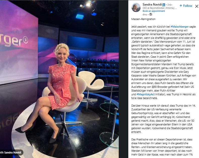 Sandra Navidi has become one of the most recognizable voices explaining the forces that shape the U.S. and global political landscape. Her commentary is clear, fast, and packed with insight. She has a style that feels both accessible and razor sharp, which makes her one of the most trusted analysts in German media. Every time she posts or appears on screen, she brings context that helps people make sense of fast moving events.