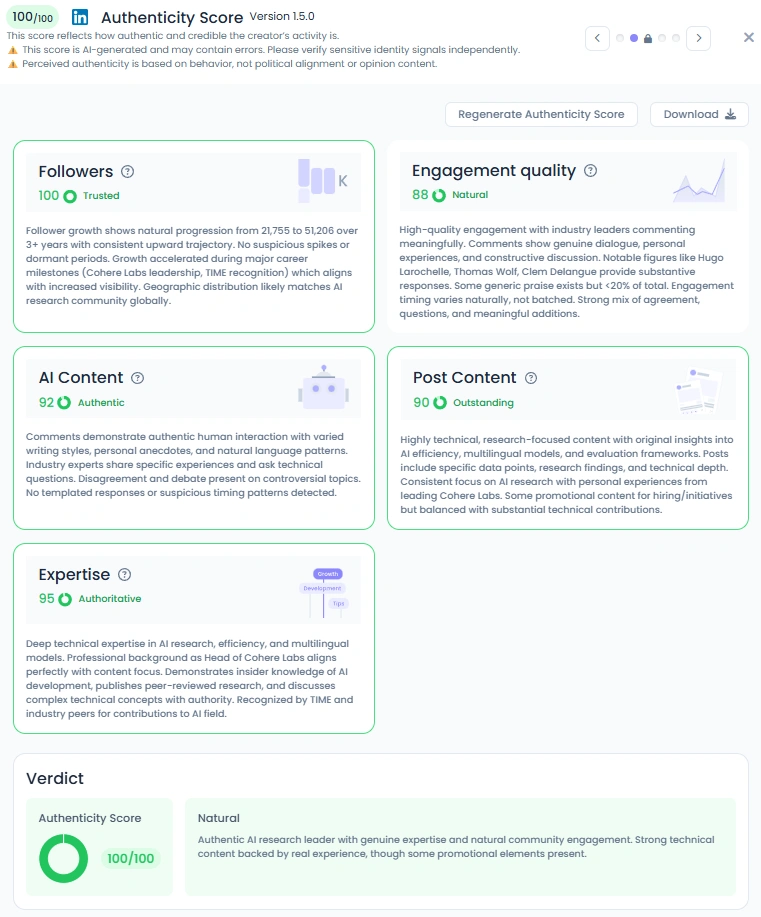 Sara holds a Favikon Authenticity Score of 100/100. Comment threads show genuine debate, personal experiences, and technical questions from recognized experts. Posts blend research updates, hiring notes, and community shout-outs. No templated hype. Just a scientist talking to peers and students with respect.