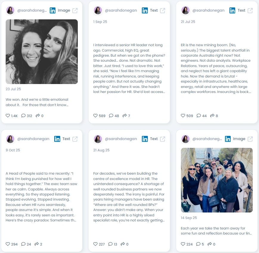 Sarah’s work is deeply intertwined with HR leaders, recruiting agencies, and business operators across Australia. She collaborates through conversations, shared insights, hiring discussions, and professional exchanges that fuel her content. Her posts reference real client experiences, market data, and themes drawn from her consulting and strategy work. These collaborative touchpoints add depth and authority to her storytelling.