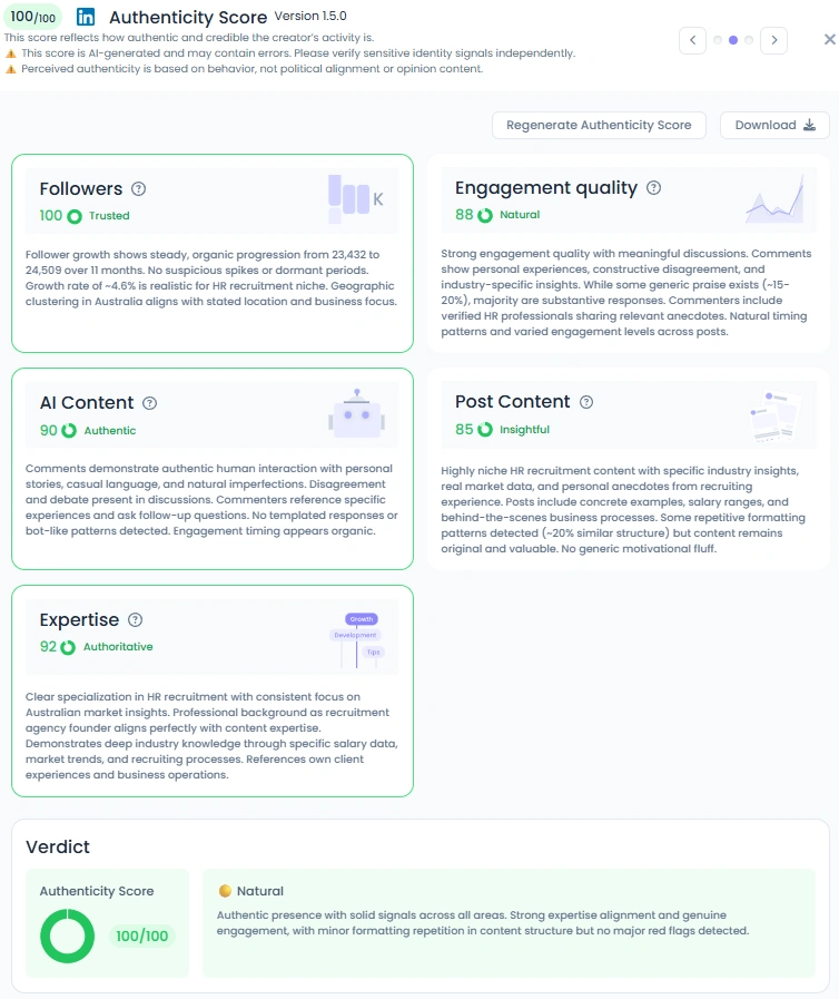 With a perfect 100/100 Favikon Authenticity Score, Sarah embodies what genuine expert presence looks like. Her content contains natural imperfections, candid reflections, and detailed examples from real recruiting conversations. She doesn’t hide behind corporate language. She posts photos with colleagues, shares behind-the-scenes moments, and isn’t afraid to show emotion in a field often defined by neutrality. Her audience engages not out of politeness but out of recognition. It feels real because it is.