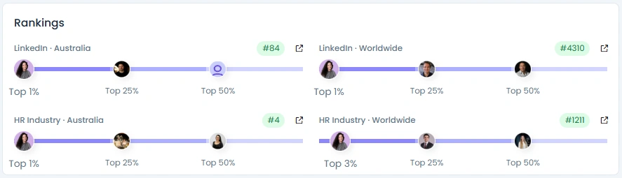 Sarah has grown from 23K to more than 24.5K followers organically in under a year, showing a healthy +4.6% growth rate. Her engagement is consistently strong, with meaningful comment threads instead of empty reactions. She holds an Influence Score of 6,164 points, placing her in the Top 1% in Australia both in LinkedIn overall and in the HR industry category. Her posting rhythm is steady, and each piece sparks debate, discussion, or agreement from verified HR professionals.