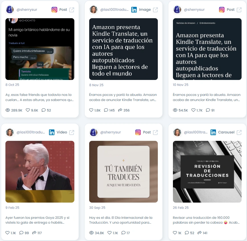 Scheherezade is a literary translator with years of experience turning stories into Spanish with precision and emotion. She has worked with major publishing houses and earned recognition for calling out the importance of human craft in translation. Her posts often mix industry challenges, personal anecdotes, and moments from her daily work. She positions herself as a clear advocate for quality and ethics in the translation world. Her tone reflects strong knowledge and a genuine love for the profession. She is one of the most visible voices pushing the conversation forward.