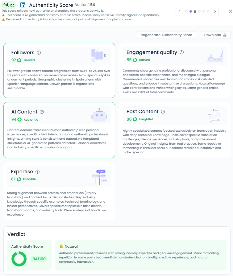 Scheherezade holds a solid Favikon Authenticity Score of 94 out of 100. Her content includes client stories, translation challenges, and real behind the scenes moments. She shares her own workflows and the human errors that come with them. Comments show deep engagement from translators who add their own experiences or ask technical questions. Her presence feels natural and aligned with her professional identity.