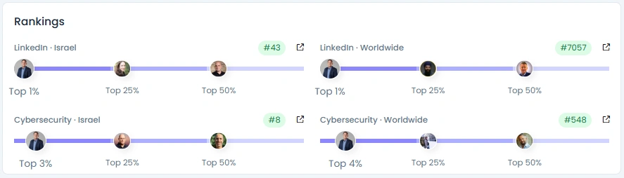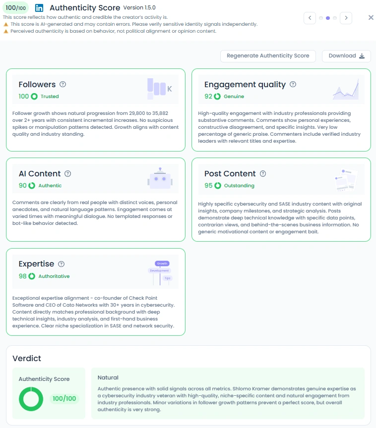 Shlomo’s metrics tell the story of sustained impact. He has an Influence Score of 6,100 points, ranks in the top 1% of LinkedIn creators in Israel, and places in the top 4% globally for Cybersecurity. His follower base has grown steadily from 29,800 to 35,882 over two years, showing natural growth that matches his consistent engagement rhythm. With an Engagement Quality Score of 92, his audience includes verified industry experts who actively join the discussion rather than simply react.