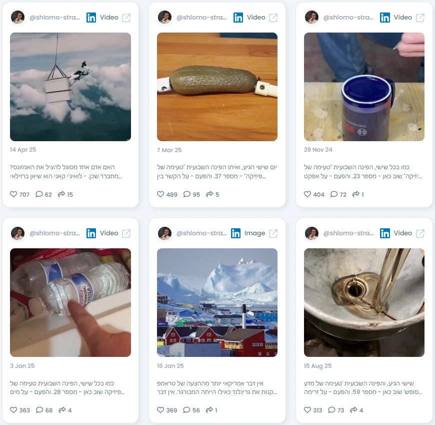 Shlomo’s network stretches across Israel’s tech and engineering ecosystem. He connects with scientists, engineers, industry founders, and innovation leaders who regularly drop into his comments to discuss data, challenge assumptions, or share field experience. His presence is also linked to respected institutions and media platforms, adding another layer of credibility. Even with a small core network, the quality is remarkably high, demonstrating depth rather than breadth. This reflects his positioning as a trusted expert rather than a mass-market influencer.
