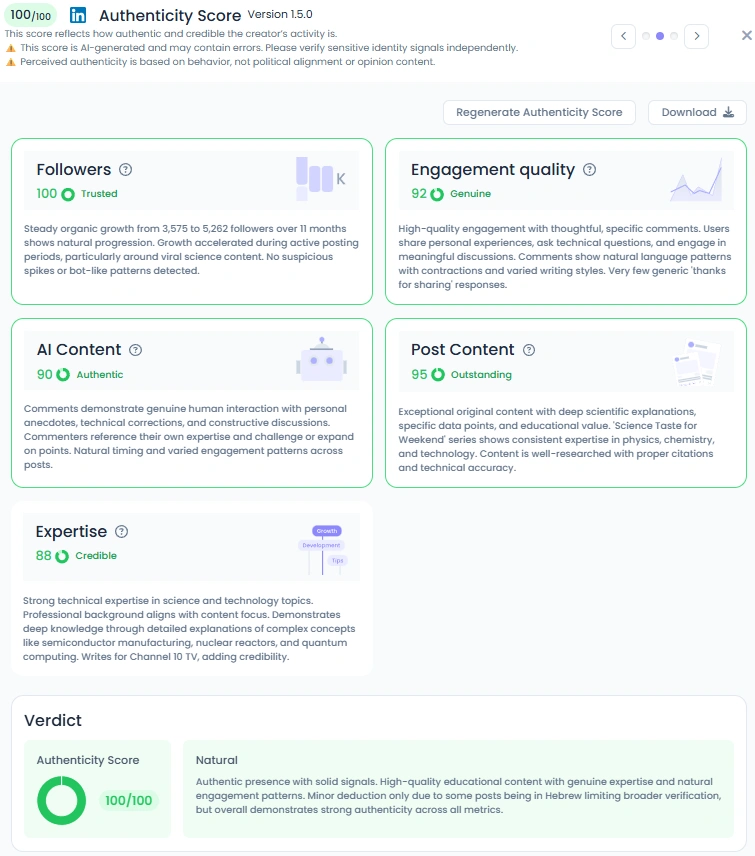 With a perfect Authenticity Score of 100/100, Shlomo shows exactly what real educational content should look like. His comments section is full of thoughtful conversations, corrections, questions, and personal experiences rather than generic praise. He posts unfiltered videos, hands-on experiments, and everyday observations that highlight genuine curiosity. Natural timing, varied writing styles, and real dialogues all reinforce that people are responding to the creator, not an algorithm. The result is a profile that feels grounded, human, and completely unforced.