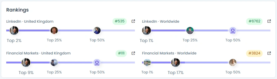 Simon’s growth is steady and organic, moving from just over 4,000 followers to more than 11,000 in four years. He ranks in the top 2% on LinkedIn in the United Kingdom and top 9% in the Financial Markets category. His engagement quality is rated at 88 out of 100, reflecting a strong professional audience that interacts meaningfully with his content. With an Influence Score of 5,268 points, his authority in financial discourse is both earned and recognized.