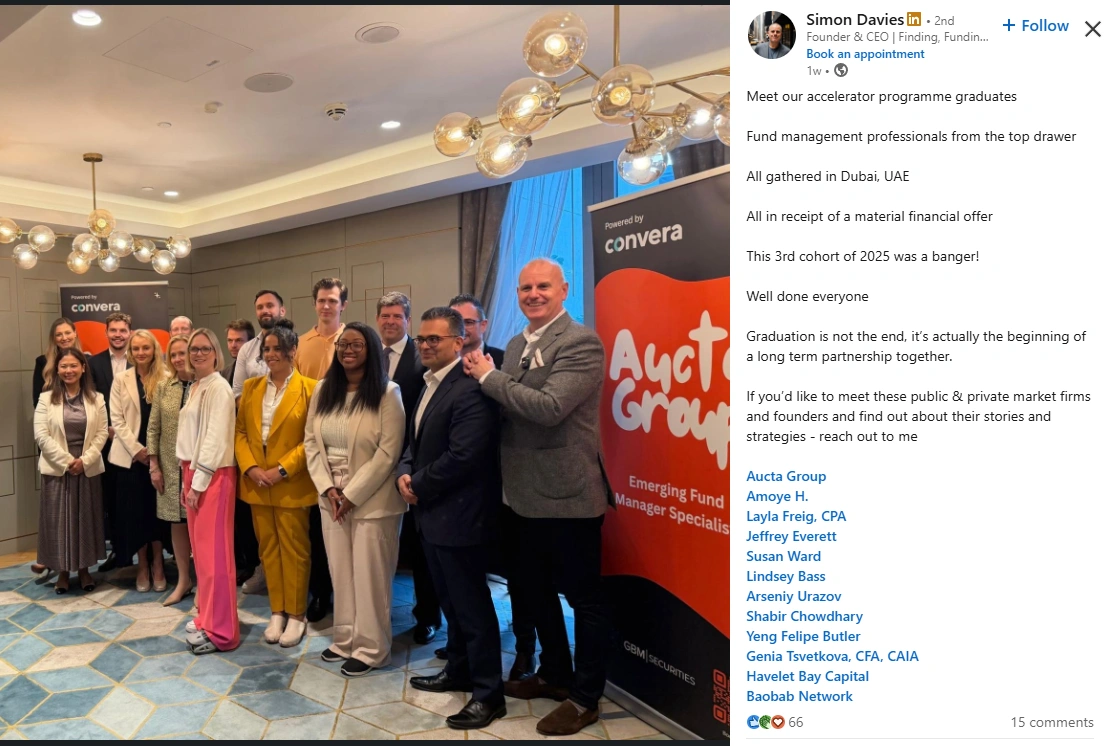 Simon Davies is a finance executive with a mission. As the Founder and CEO of Aucta Group, he leads an accelerator designed to empower emerging fund managers and investment professionals. With years of experience in fund management and regulatory expertise, he has built a platform that bridges institutional finance with entrepreneurial innovation. Simon is also SCA-regulated in the UAE, further strengthening his professional authority. His posts often highlight the human side of leadership, from global business travels to moments with his family, showing the balance between industry insight and authenticity.