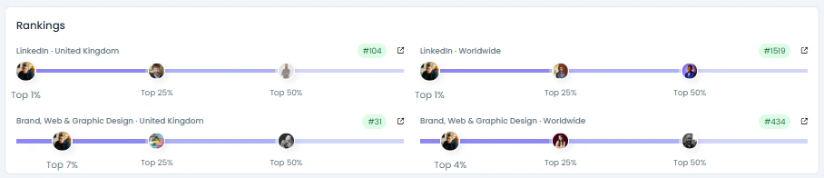 His audience climbed from 35k to 54k followers in just over two years with steady organic growth. Engagement quality sits at 88 and post content quality at 87 with 92 on AI content authenticity and 91 on expertise. Influence Score totals 7,543 points. Rankings place him in the top 1% on LinkedIn in the UK and top 4% worldwide for Brand, Web and Graphic Design.