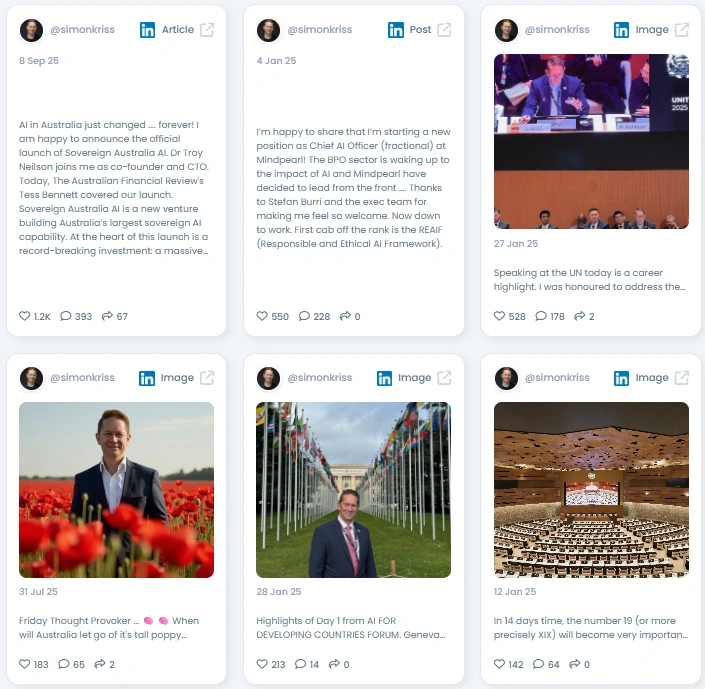 Simon Kriss is an AI adoption expert and keynote speaker focused on customer experience and responsible AI. Based in Australia, he advises organisations on governance, implementation, and the people side of AI. His work ranges from public sector briefings to product launches and academic collaboration. Simon co-founded and led high-profile initiatives, spoke at UN forums, and recently helped launch Sovereign Australia AI and related ventures. He brings a hands-on approach to model implementation and governance, combining research, policy, and operational delivery. That practical mix positions him as a go-to translator between technologists and decision makers.
