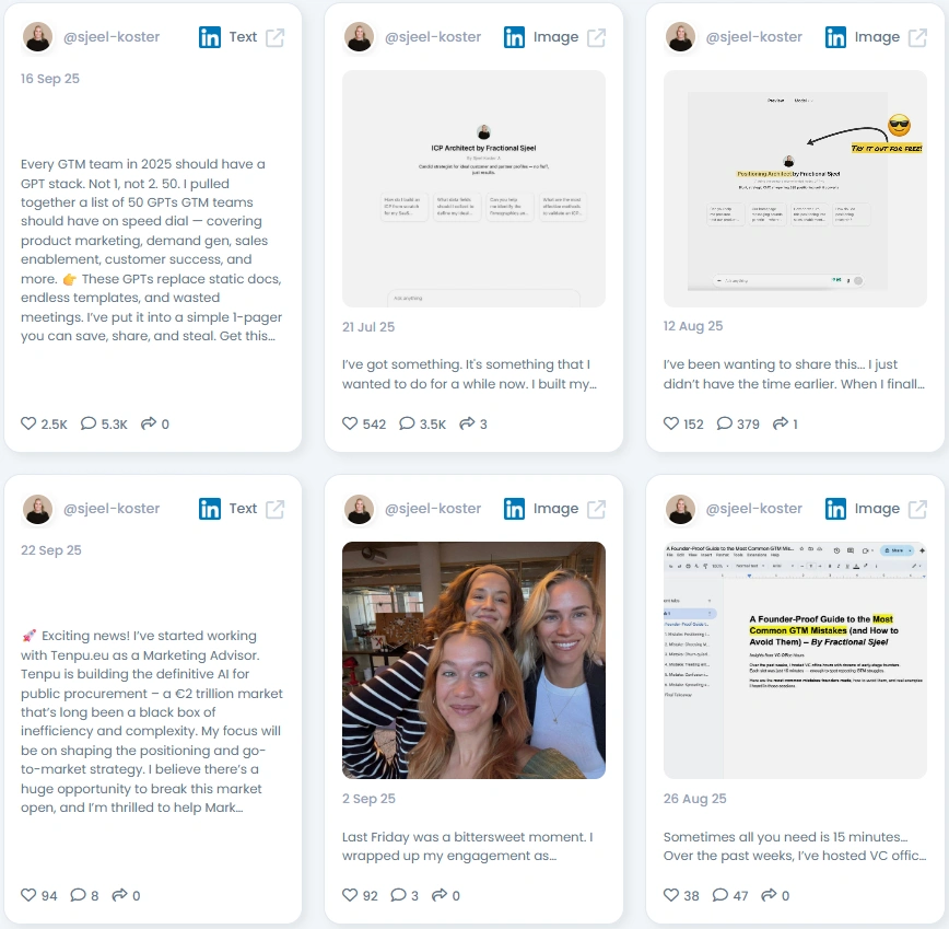 Her content hits the sweet spot between strategy and execution. Sjeel does not just share theories; she builds and shares tools, templates, and insights that startup teams can use immediately. She writes with the clarity of someone who has been in the trenches, often blending humor and self-awareness to keep things human. Whether she is posting about GTM AI stacks or the emotional side of leadership, her tone stays approachable, direct, and refreshingly transparent.