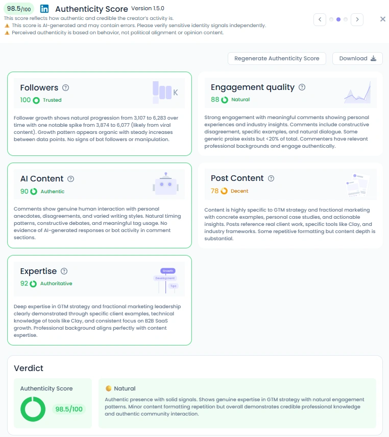 With a Favikon Authenticity Score of 98.5/100, Sjeel stands out for her genuine industry dialogue. She engages in thoughtful debates, answers questions, and welcomes disagreement, proving her content is not just broadcast; it is conversation. Her posts include personal anecdotes and real client examples that reflect experience rather than ego. That balance between credibility and accessibility is what keeps her community active and growing.