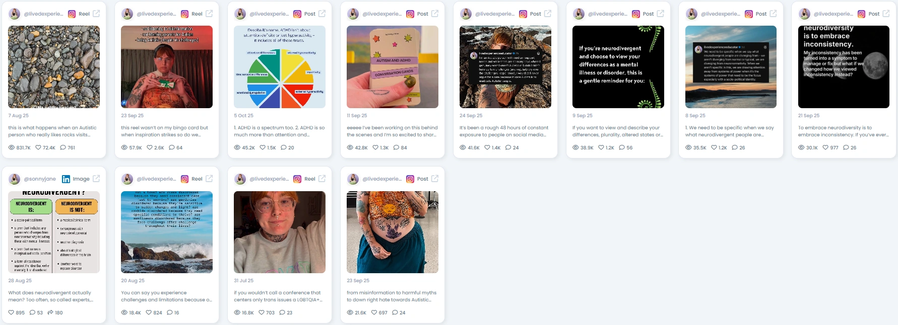 Sonny champions neurodiversity and mental health with a focus on dignity, agency, and social justice. They push back on deficit-only narratives and show how language can harm or heal. Posts model consent, community care, and self-definition, especially for trans and gender-diverse neurodivergent people. They advocate for workplaces and schools to move from “managing symptoms” to redesigning environments.