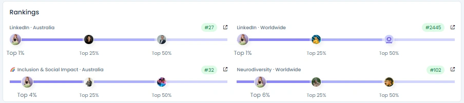 Influence score sits at 8,080 points with top 1% ranking on LinkedIn in Australia (#27) and strong global placement in Neurodiversity (#102). Followers grew from 14.6K to 23.7K across three years, a clean, organic climb. Reels regularly land huge reach, with standout posts topping 800K views and 70K+ likes. Posting cadence is steady, and engagement stays substantive.