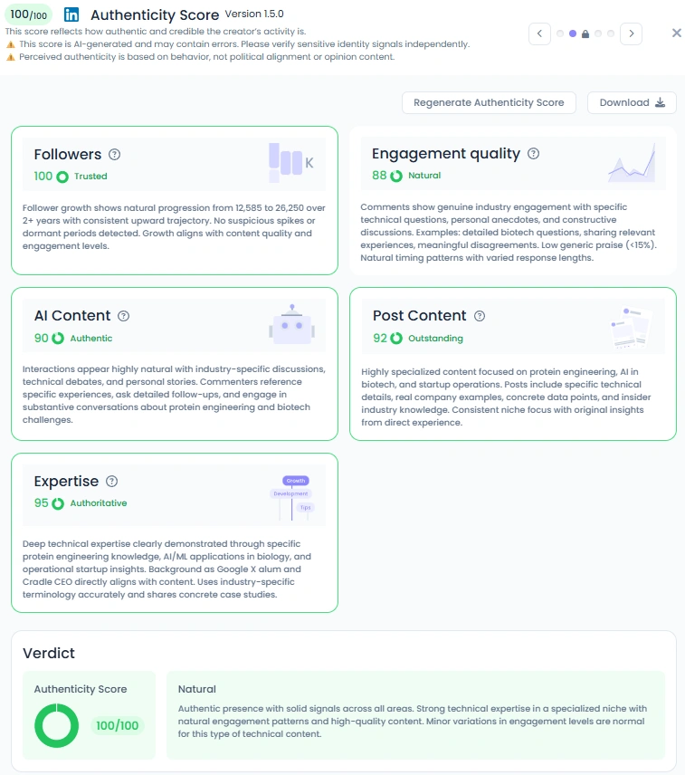 With an exceptional Favikon Authenticity Score of 100/100, Stef’s presence is as genuine as it gets. His engagement is built on real conversations with scientists, founders, and engineers, not on generic comments or buzzwords. Each post reflects his personality: insightful, transparent, and rooted in experience. Whether he’s announcing Cradle’s funding rounds or sharing photos from team gatherings, Stef’s content feels human and deeply credible.