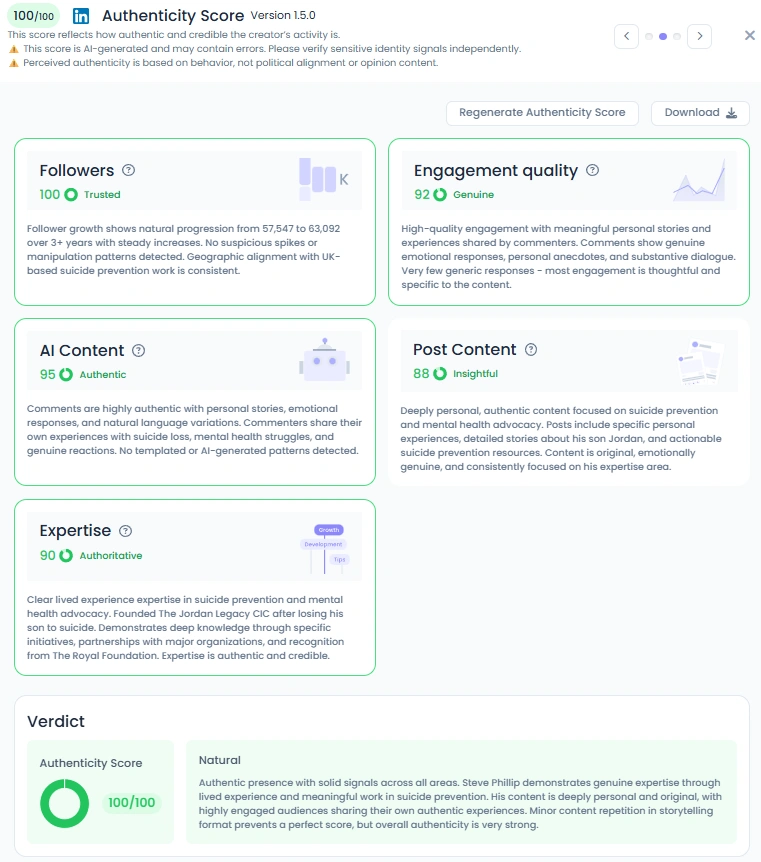With an Favikon Authenticity Score of 100/100, Steve embodies what it means to be real online. His posts often include family moments, heartfelt reflections, and updates on The Jordan Legacy’s progress. Engagement on his content is filled with emotional reactions and shared experiences, not surface-level likes. His openness has made him one of LinkedIn’s most trusted voices on mental health, proving that vulnerability is a powerful form of leadership.