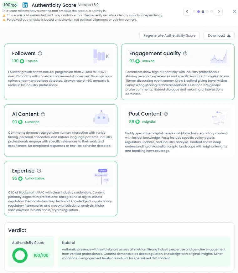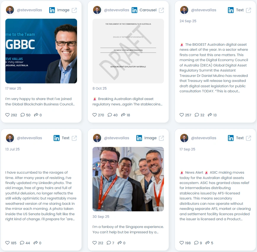Steve’s Influence Score stands at 6,701 points, supported by a following of over 30,000 professionals. He ranks in the Top 1% on LinkedIn in Australia and Top 6% in Fintech & Crypto worldwide. His engagement remains steady, with posts averaging over 250 reactions and thoughtful commentary from top industry voices. His follower growth of 9% annually reflects consistent credibility and organic reach.