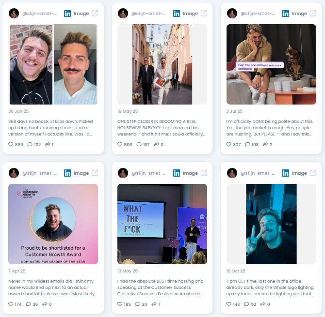 Stijn Smet mixes hard metrics with warm storytelling. He leads customer success at Whale and talks openly about growth, failure, and identity. His posts feel like a conversation with a sharp, supportive colleague. People follow him for practical advice and a very human perspective on work.