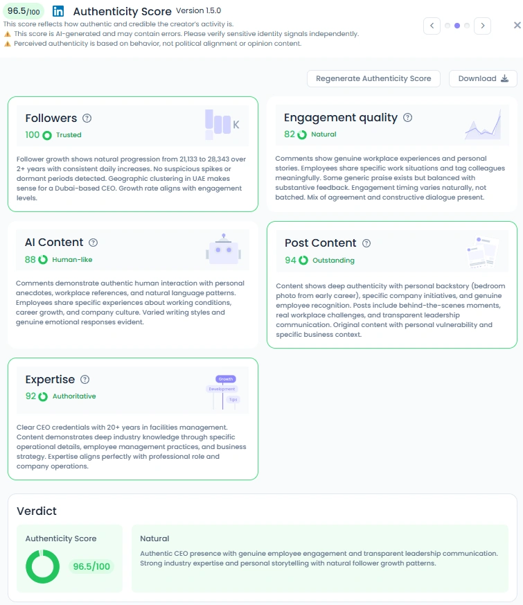 With an Favikon Authenticity Score of 96.5/100, Stuart’s presence feels real and personal. His content includes snapshots of site visits, celebrations with staff, and even a heartfelt post about his early career days, connecting his audience to his story on a human level. His Post Content score of 94 highlights the thoughtfulness behind his updates, which balance business insights with genuine appreciation for people. Followers respond not to staged PR moments but to the sincerity and transparency that come through in every post.