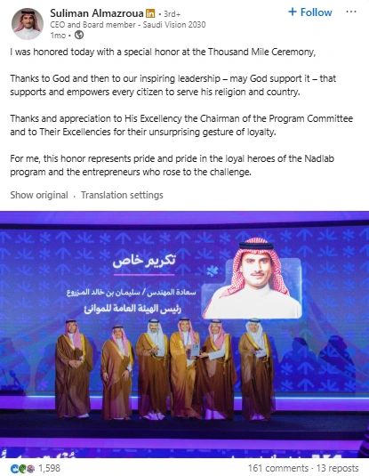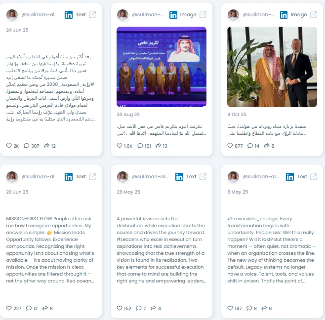 Suliman’s updates track partnerships across ports, logistics corridors, and industrial zones. He spotlights awards that honor program contributors and entrepreneurs. He shares progress from visits, ceremonies, and strategy sessions. These touchpoints show alignment between leadership, operators, and the startup community.