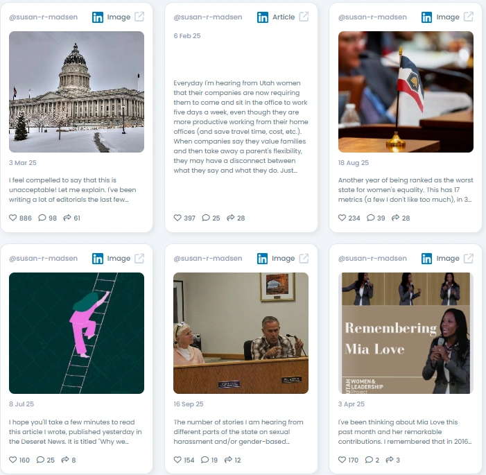 Susan’s Influence Score is 6 with 5,383 points, and her follower base has grown steadily from about 13,000 to 18,244 over two plus years. Her posts draw hundreds of reactions and thoughtful comments, especially on issues of workplace policy and gender equity. She posts regularly, combining long-form analysis with short updates that spark conversation among leaders and educators.