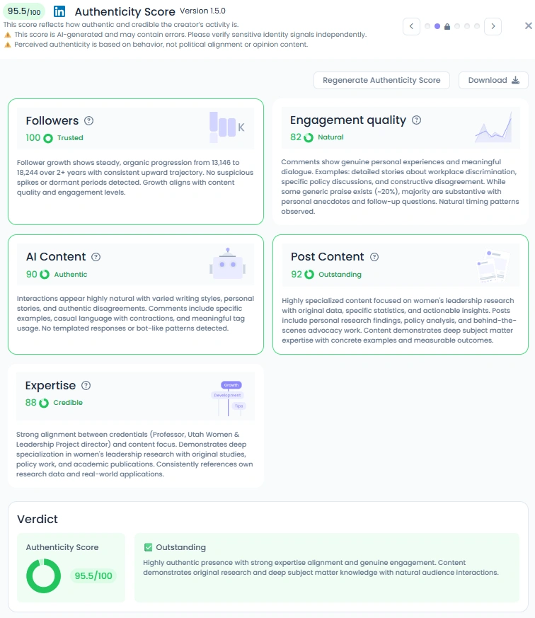 Favikon gives Susan a 95.5/100 Authenticity Score, showing strong, consistent signals across her work. Her feed mixes research summaries, event notes, and opinion pieces that clearly come from direct experience. Comments and engagement include thoughtful dialogue from academics, practitioners, and civic leaders. That pattern shows she builds real community around evidence-based advocacy.