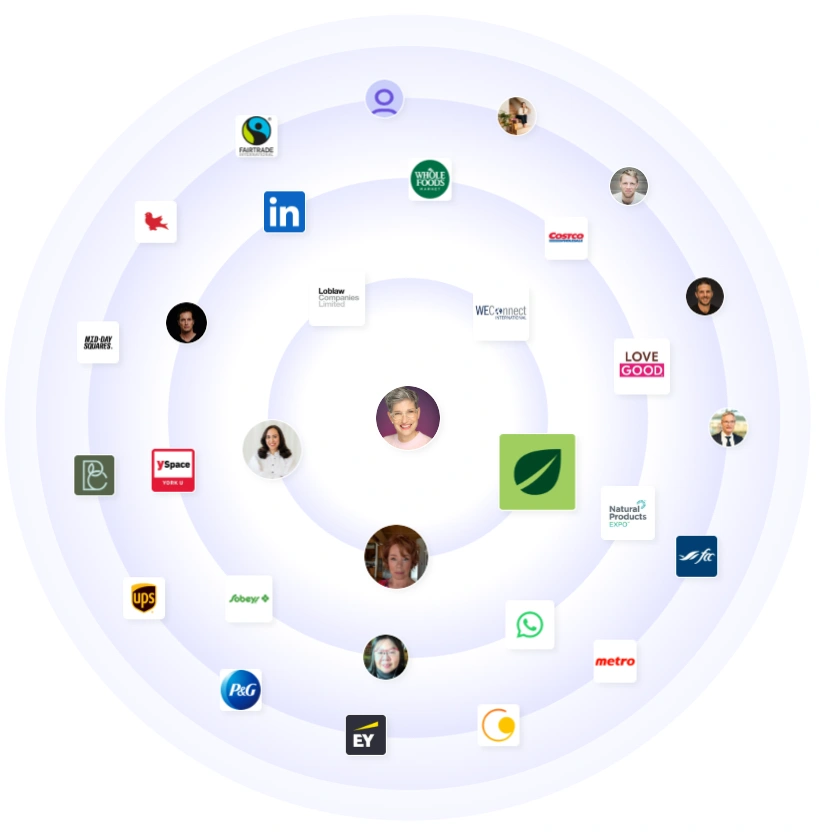 Her orbit includes Walmart, Costco, Sobeys, Whole Foods, Loblaw, and Metro. She connects with WEConnect, Natural Products Expo, and trade leaders who shape the aisle. The map also features P&G, EY, UPS, and operators across manufacturing and logistics. This is the circle where listings happen and scale becomes real.