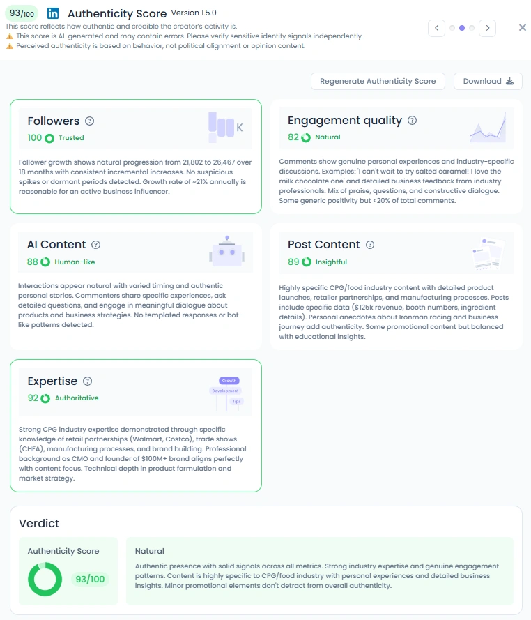 Favikon rates her authenticity at 93/100. Comments come from founders, buyers, and consumers swapping real feedback. She posts candid shots from trade shows, team tables, and warehouse aisles. The mix of personal stories and hard numbers keeps trust high.
