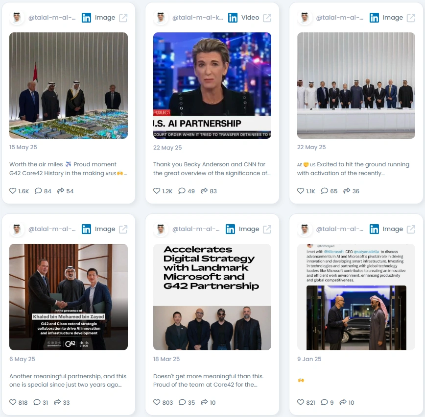 Talal’s network speaks for itself. He interacts with top leaders across NVIDIA, Microsoft, AMD, BlackRock, and Oracle. His ecosystem includes government institutions, global CEOs, policy makers, and regional innovation hubs. This proximity to decision makers elevates his credibility and makes his content highly influential inside and outside the UAE.