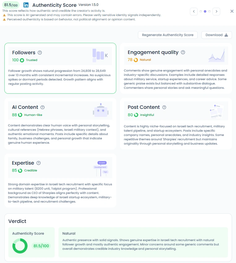 With an Favikon Authenticity Score of 81.5/100, Tammy’s content shows real passion and purpose. Her storytelling often includes Hebrew expressions, humor, and reflections on Israeli culture, making her posts feel local yet universal. She openly discusses her professional challenges, successes, and gratitude moments, building trust with her audience. Her mix of personal snapshots and team photos reminds followers that leadership is about people, not just performance.