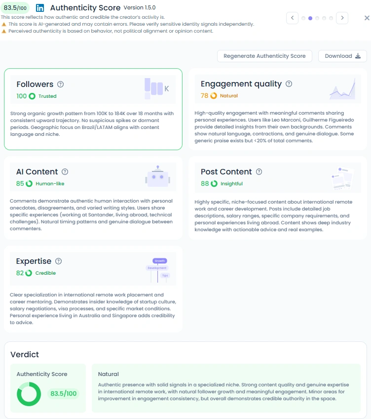 Favikon pegs her authenticity at 83.5 out of 100, with human-like interactions and insightful post content. Comments are personal and grounded in lived experience, from salary ranges to visa timelines. You’ll see varied writing styles, disagreements handled respectfully, and zero templated replies. The energy is community first, creator second.